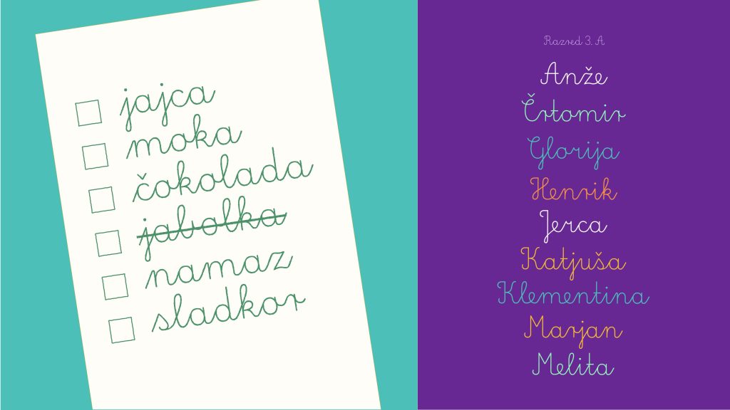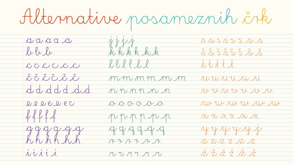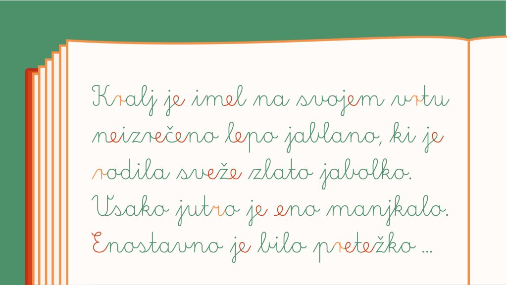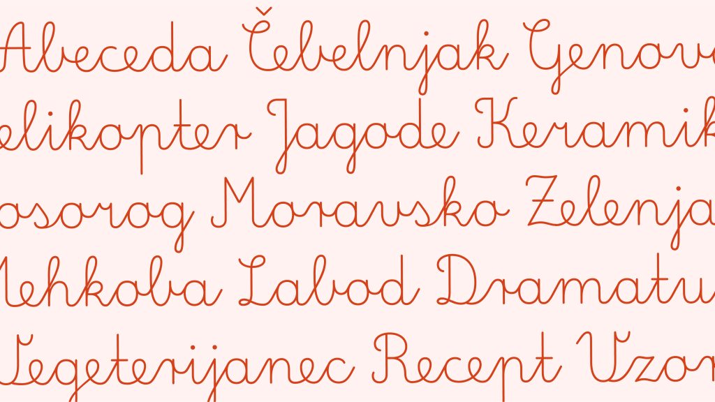 My latest project is typeface Pisanka, developed at the request of a group of teachers. It reflects the model of handwriting taught in Slovene primary schools. Pisanka includes alternative forms of letters that allow for smooth and authentic connections between characters. These variants cover initial, medial, and final forms, as well as isolated letter shapes.